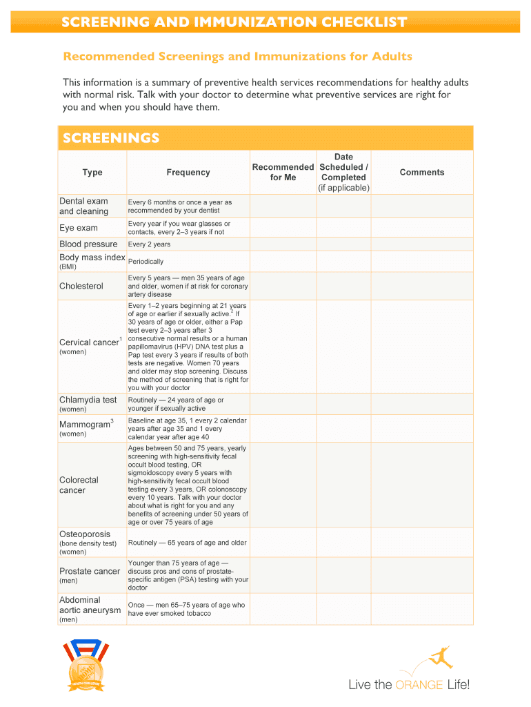 SCREENING AND IMMUNIZATION CHECKLIST Recommended Screenings and Immunizations for Adults This information is a summary of preventive health services recommendations for healthy adults with normal
