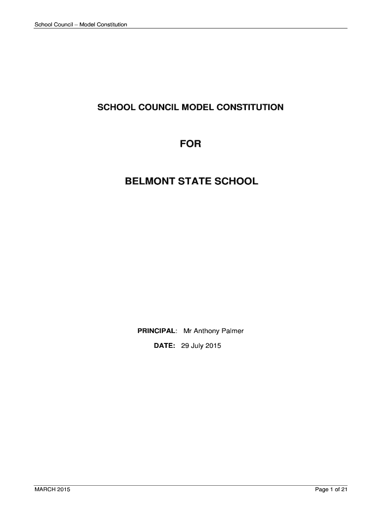 School Council Model Constitution SCHOOL COUNCIL MODEL CONSTITUTION FOR BELMONT STATE SCHOOL PRINCIPAL: Mr Anthony Palmer DATE: 29 July 2015 MARCH 2015-Page 1 of 21 School Council Model Constitution