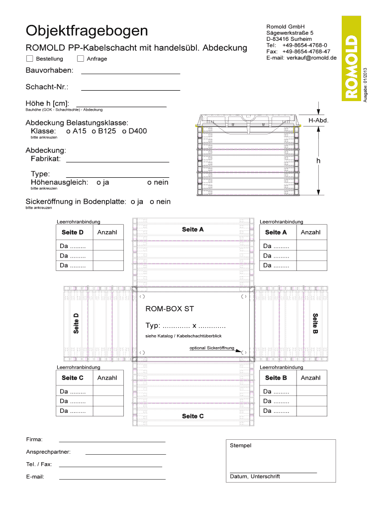 Objektfragebogen REMOLD PPKabelschacht MIT handles. Abducting Bestselling Average SchachtNr.: Mugabe: 01/2013 Bauvorhaben: Remold GmbH Sgewerkstrae 5 D83416 Durham Tel: +49865447680 Fax: +498654476847