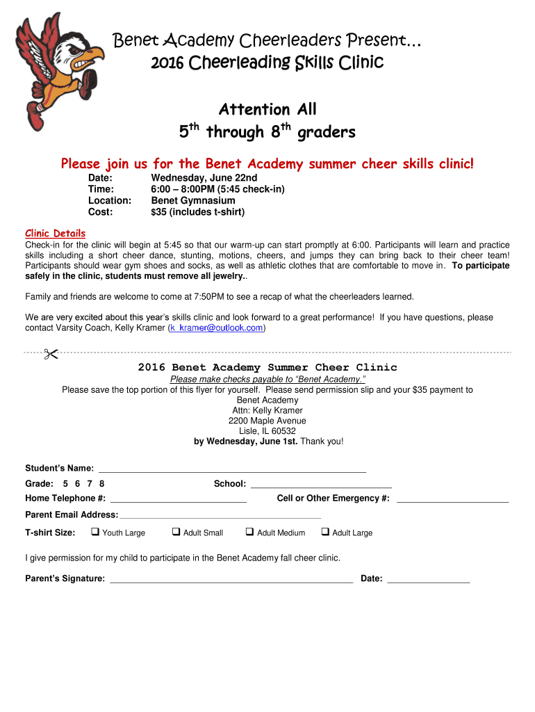 Benet Academy Cheerleaders Present 2016 Cheerleading Skills Clinic 5th Attention All through 8th graders Please join us for the Benet Academy summer cheer skills clinic! Date: Time: Location: Cost: