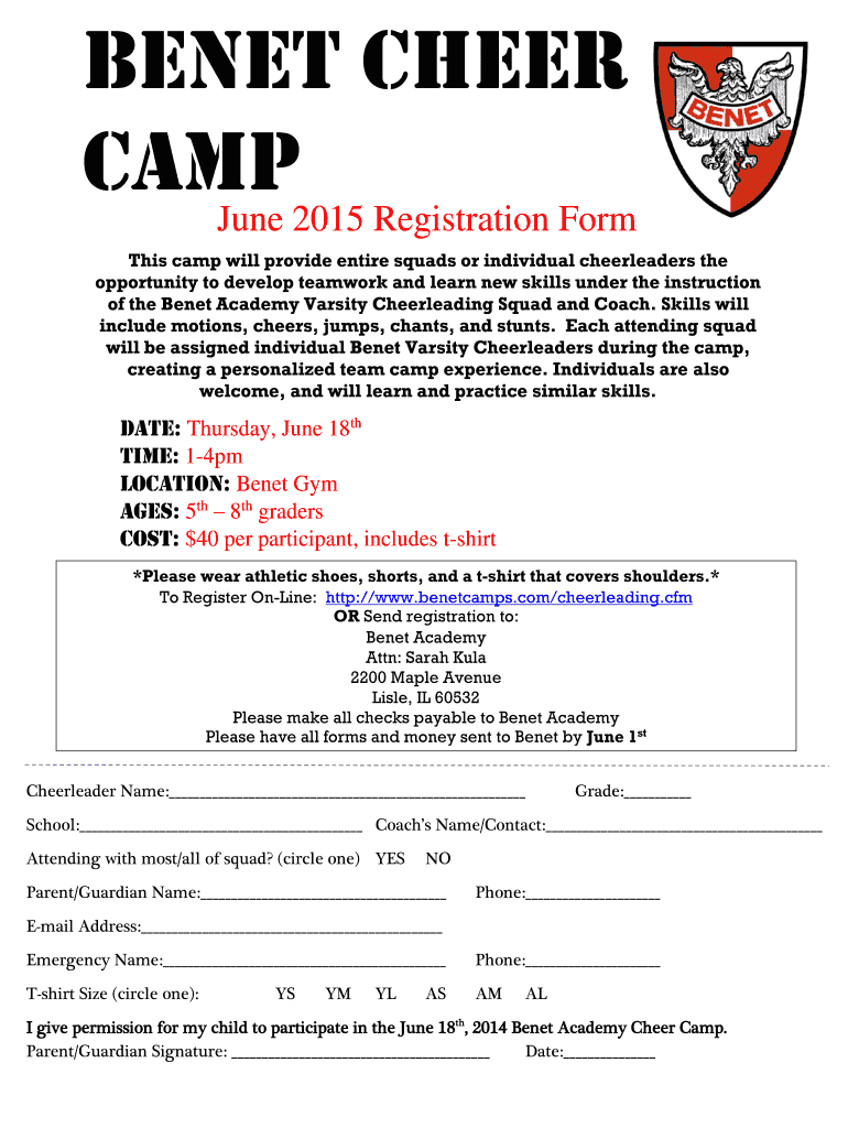 BENET CHEER CAMP June 2015 Registration Form This camp will provide entire squads or individual cheerleaders the opportunity to develop teamwork and learn new skills under the instruction of the Benet