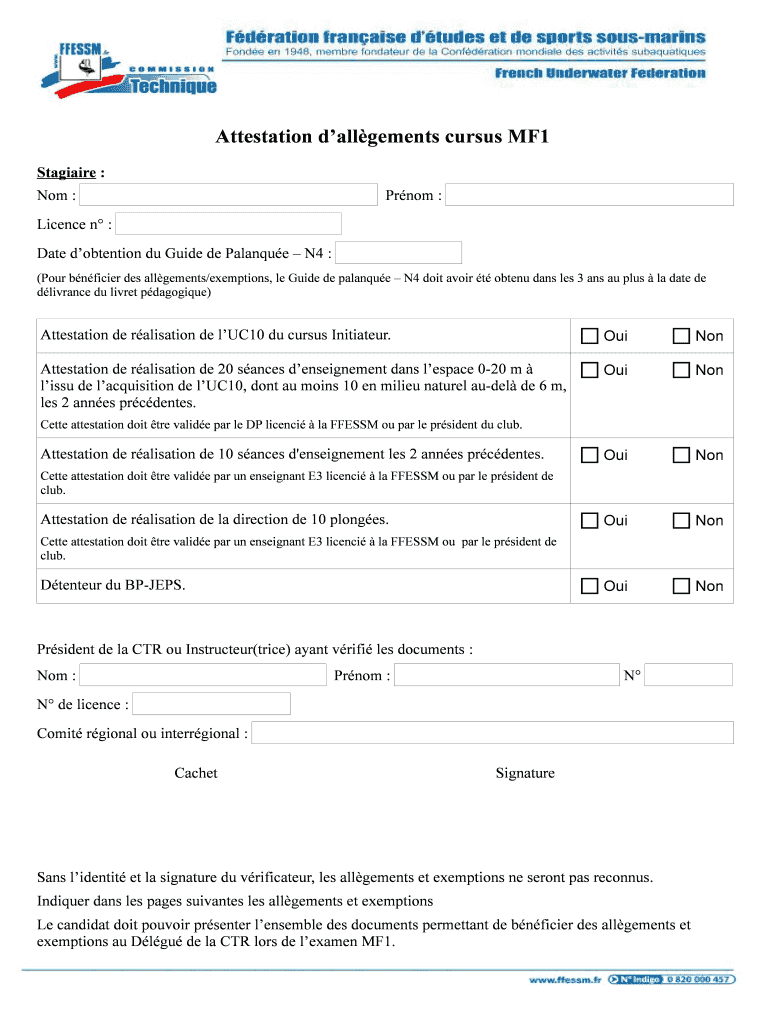 Get the free Attestation dallgements cursus MF1 - plongee-cias