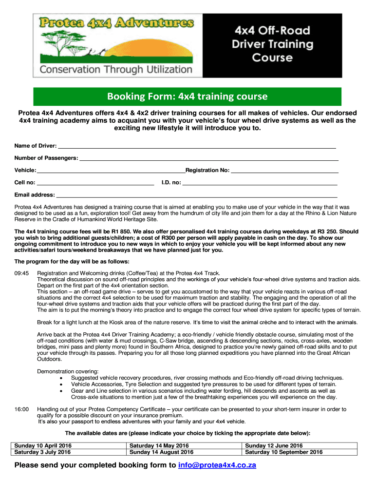 Get the free Booking Form 4x4 training course - protea4x4 co
