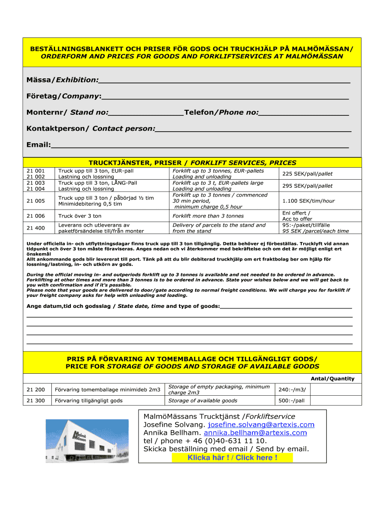 BESTLLNINGSBLANKETT OCH PRIMER FR GODS OCH TRUCKLE P MALAYSIAN/ PERFORM AND PRICES FOR GOODS AND FORKLIFTSERVICES AT MALAYSIAN MSSA/Exhibition: Freytag/Company: Monterey/ Stand no: Telephone/Phone