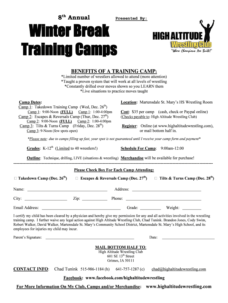 8th Annual Presented By: Winter Break Training Camps BENEFITS OF A TRAINING CAMP: *Limited number of wrestlers allowed attending (more attention) *Taught a proven system that will work at all levels
