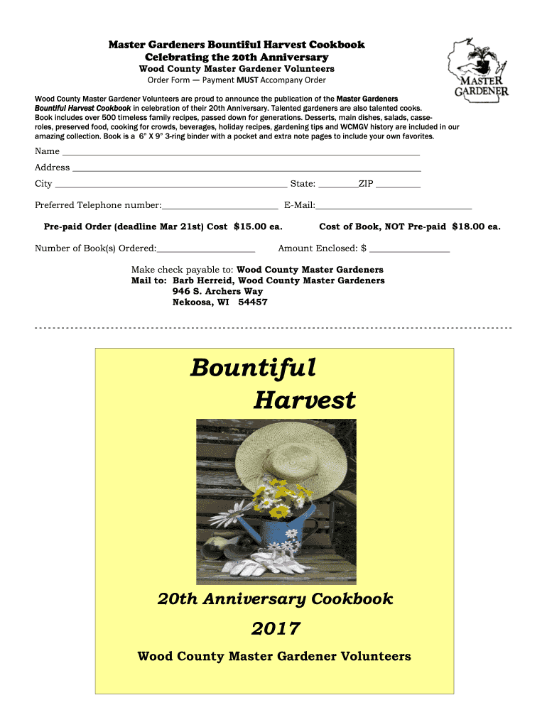 Master Gardeners Bountiful Harvest Cookbook Celebrating the 20th Anniversary Wood County Master Gardener Volunteers Order Form Payment MUST Accompany Order Wood County Master Gardener Volunteers are