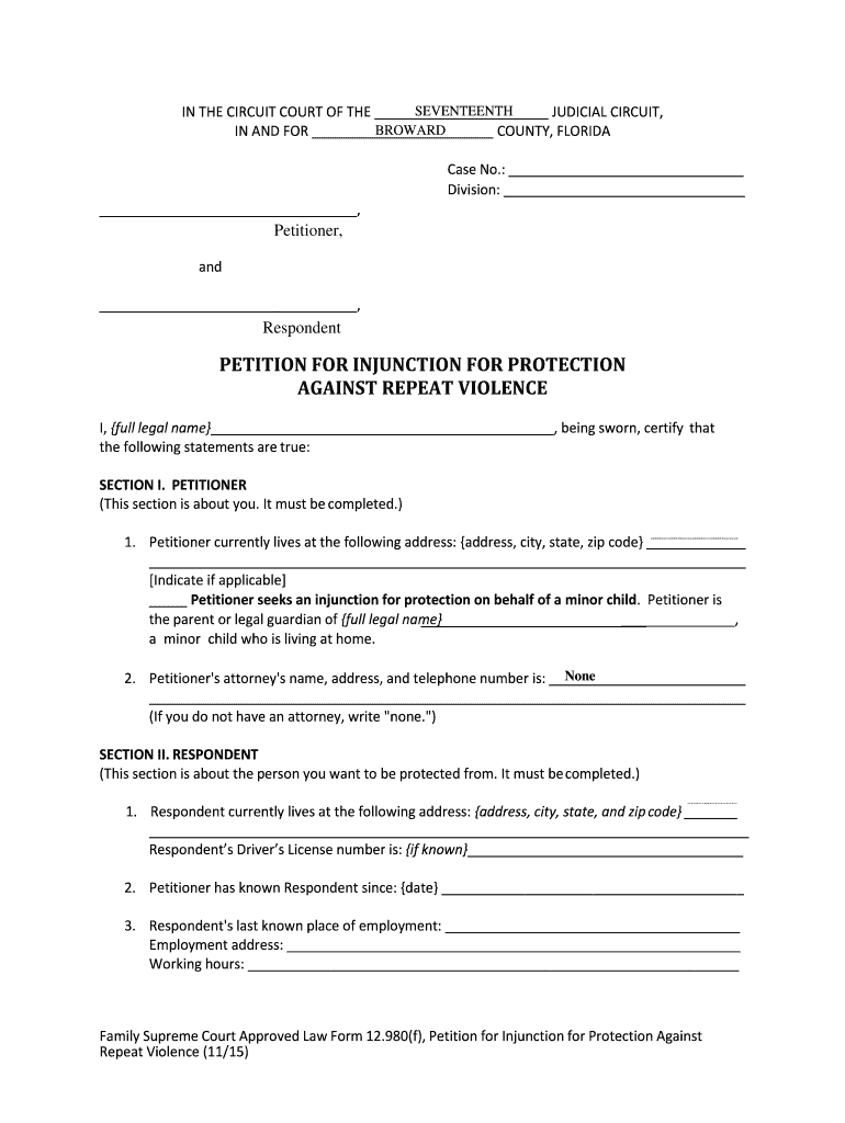 SEVENTEENTH IN THE CIRCUIT COURT OF THE JUDICIAL CIRCUIT, BROWARD IN AND FOR COUNTY, FLORIDA Case No.: Division:, Petitioner, Petitioner, and, Respondent, Respondent PETITION FOR INJUNCTION FOR PROTECTION