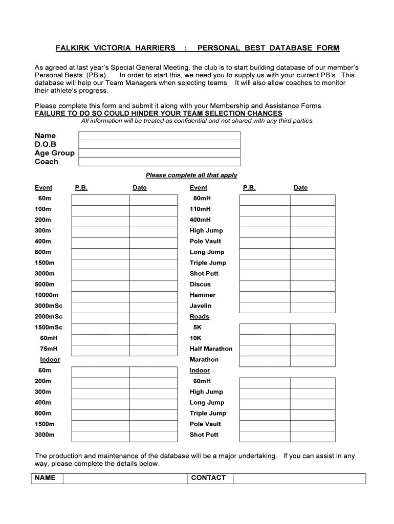 SELKIRK VICTORIA HARRIERS : PERSONAL BEST DATABASE FORM As agreed at last year's Special General Meeting, the club is to start building database of our members Personal Bests (PB's). In order to start