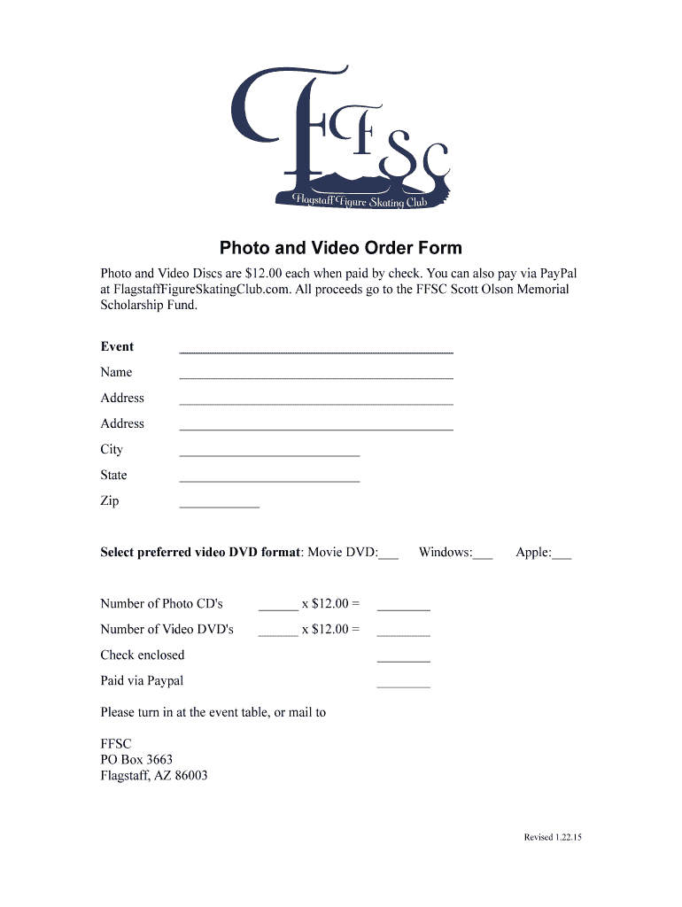 Photo and Video Order Form Photo and Video Discs are $12.00 each when paid by check. You can also pay via PayPal at FlagstaffFigureSkatingClub.com. All proceeds go to the FFMC Scott Olson Memorial