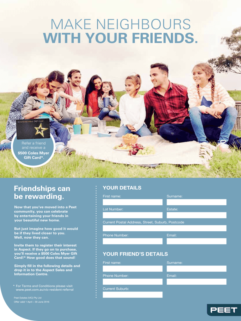 MAKE Neighbors WITH YOUR FRIENDS. Refer a friend and receive a ×500 Cole's Mayer Gift Card×. Friendships can be rewarding. Now that you've moved into a Meet community, you can celebrate by entertaining