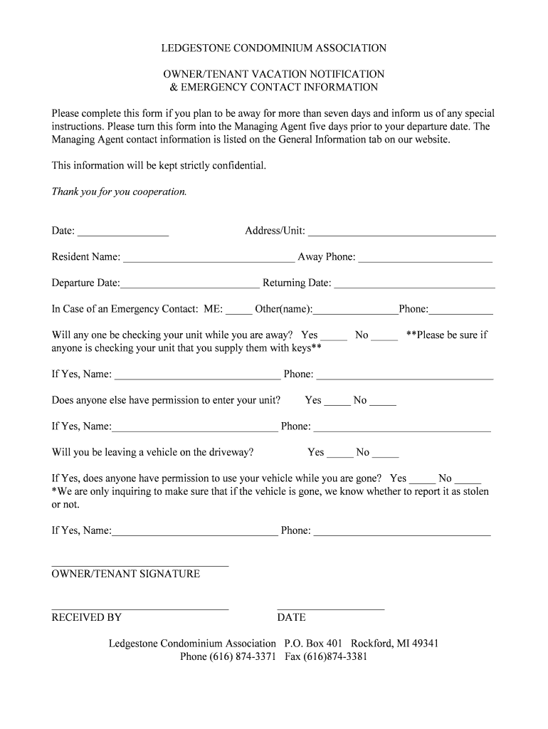 LODESTONE CONDOMINIUM ASSOCIATION OWNER/TENANT VACATION NOTIFICATION & EMERGENCY CONTACT INFORMATION Please complete this form if you plan to be away for more than seven days and inform us of any