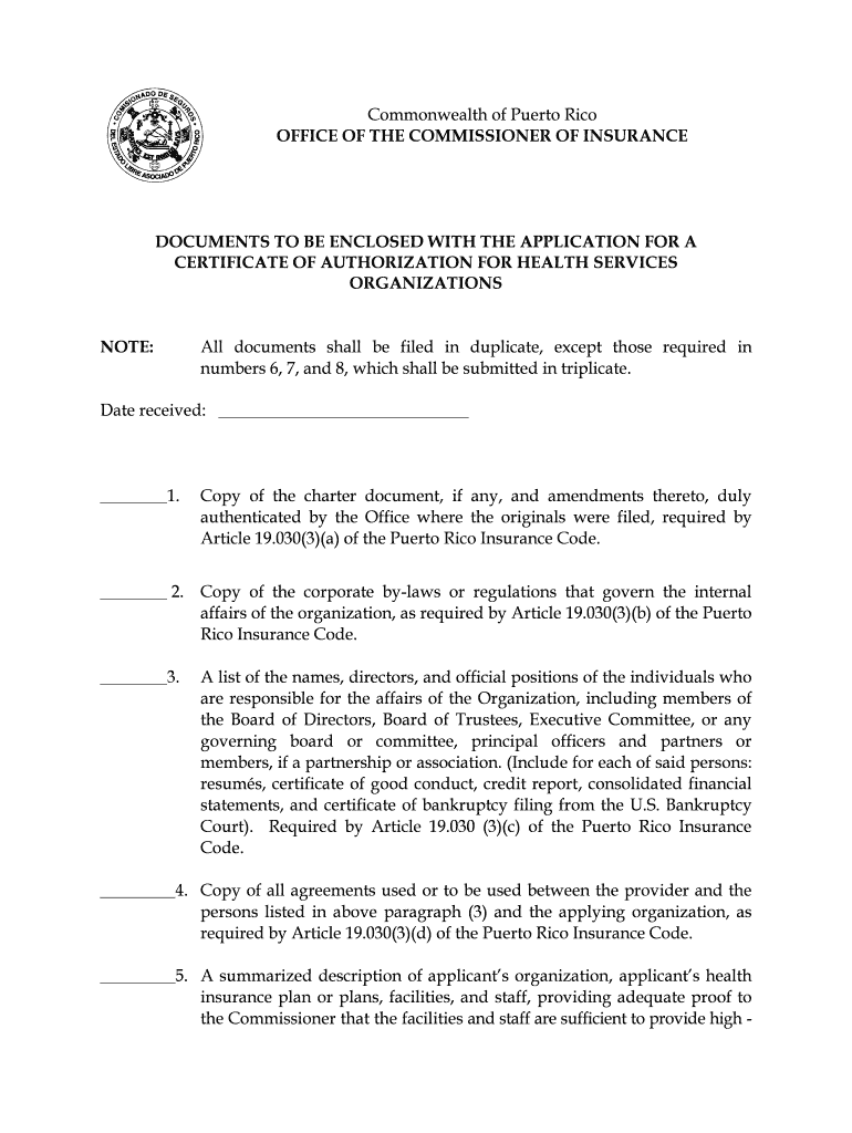 This document outlines the necessary documents and requirements for applying for a certificate of authorization for health services organizations in Puerto Rico, as per the Puerto Rico Insurance Code.