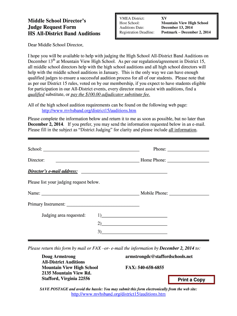 Middle School Directors Judge Request Form HS District Band Auditions VMA District: Host School: Auditions Date: Registration Deadline: XV Mountain View High School December 13, 2014, Postmark December