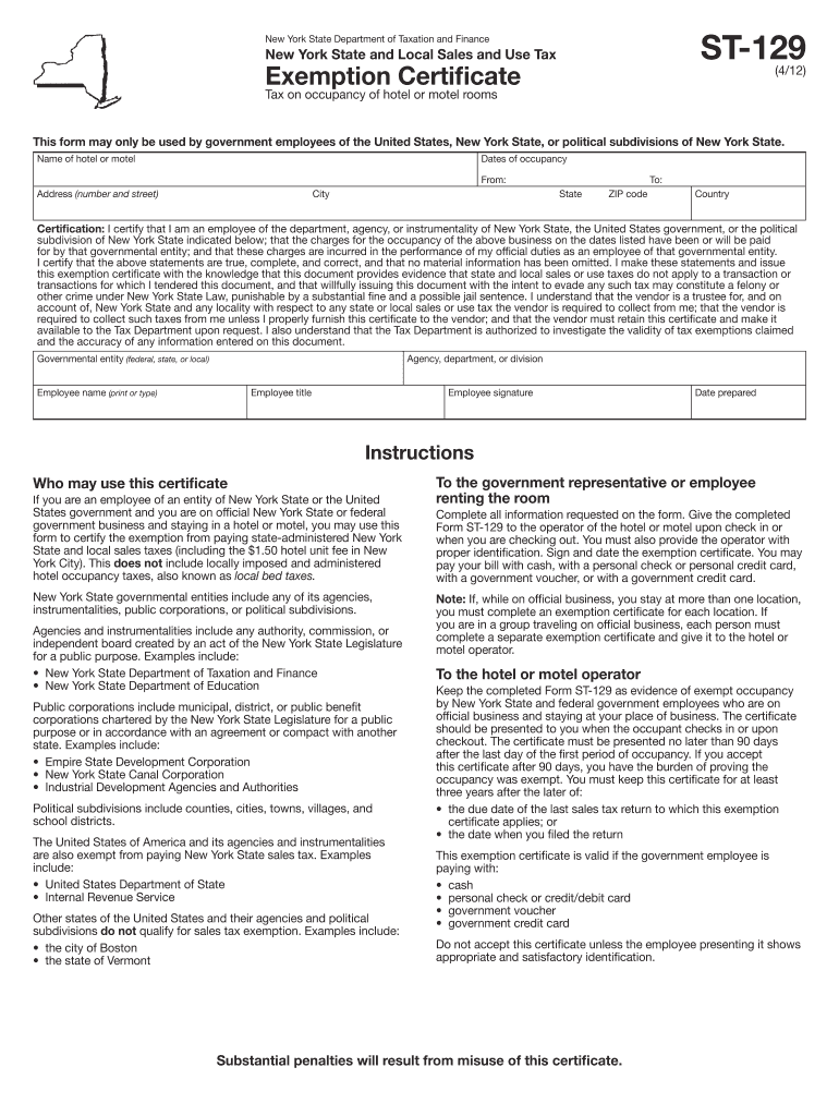 ST129 New York State Department of Taxation and Finance New York State and Local Sales and Use Tax Exemption Certificate (4/12) Tax on occupancy of hotel or motel rooms This form may only be used