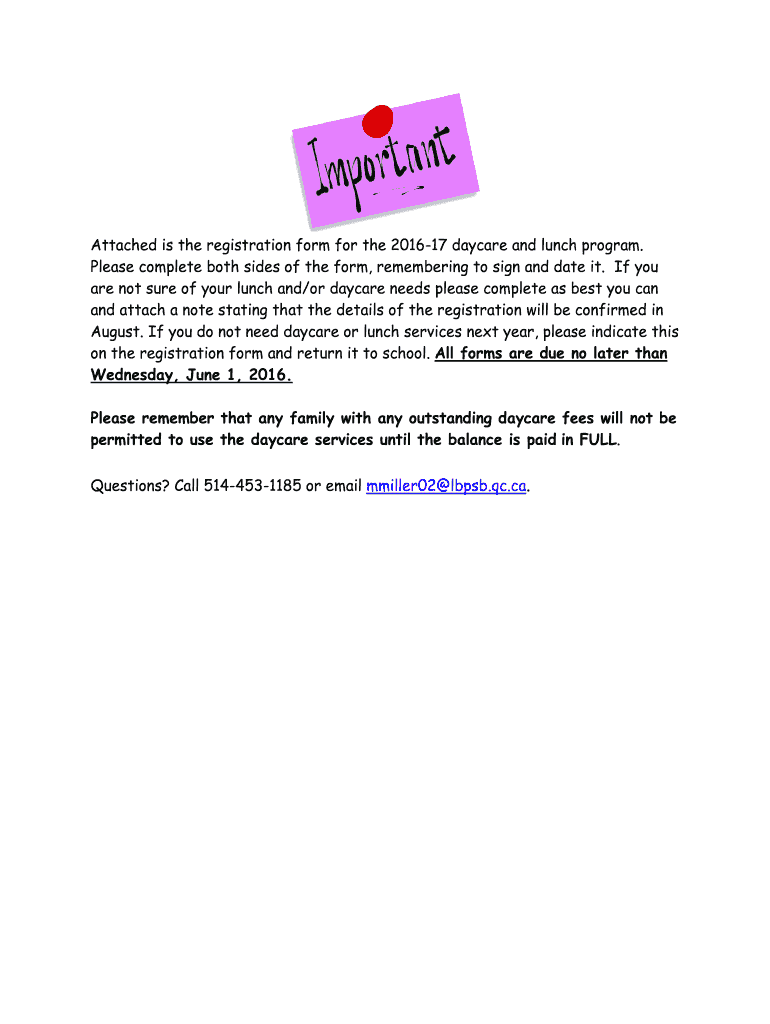 Attached is the registration form for the 2016 17 daycare and lunch programs.