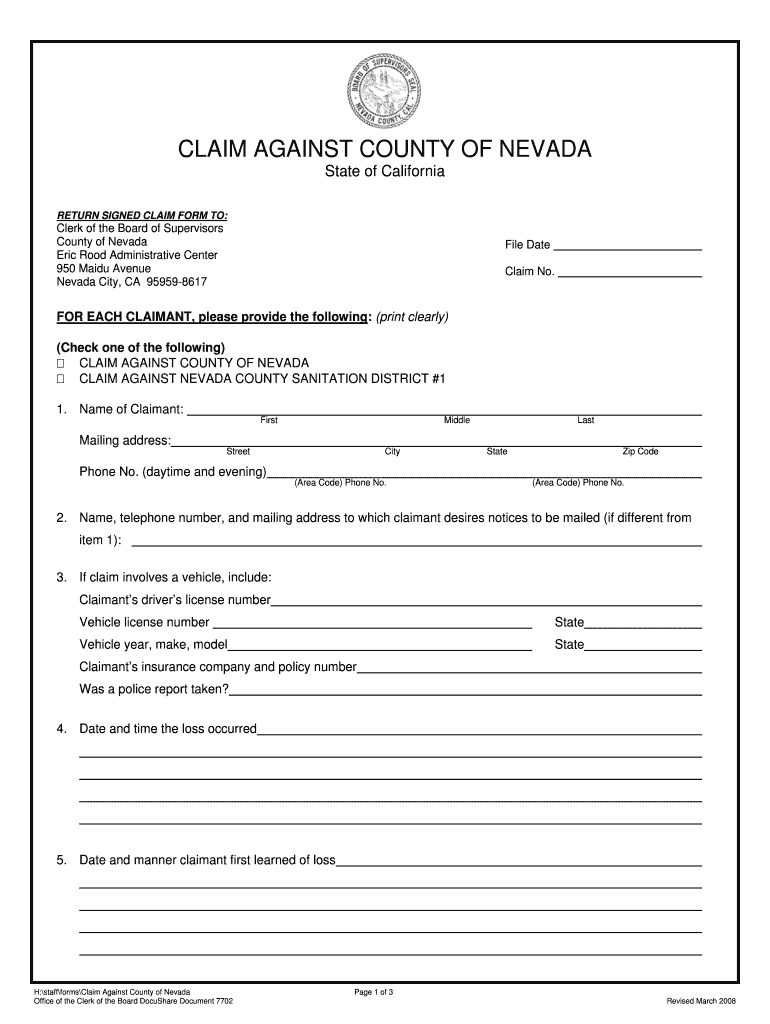 CLAIM AGAINST COUNTY OF NEVADA State of California RETURN SIGNED CLAIM FORM TO: Clerk of the Board of Supervisors County of Nevada Eric Rood Administrative Center 950 Maid Avenue Nevada City, CA 959598617