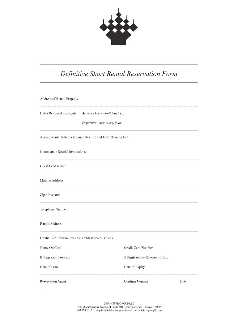 Definitive Short Rental Reservation Form Address of Rental Property Dates Required For Rental Arrival Date month/day/year Departure month/day/year Agreed Rental Rate including Sales Tax and Exit Cleaning