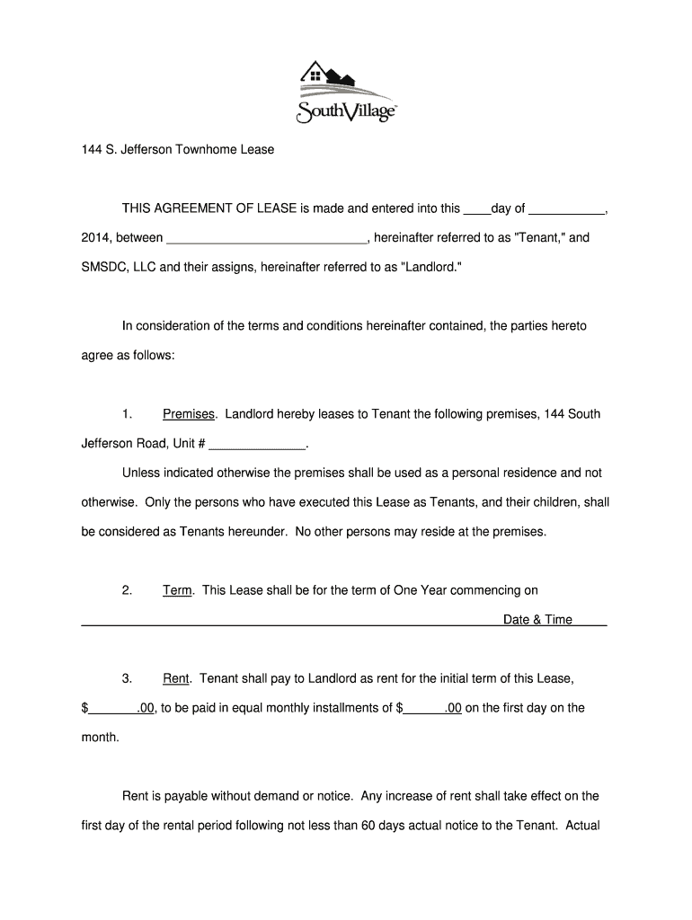 Get the free 144 S Jefferson Townhome Lease THIS AGREEMENT OF LEASE is
