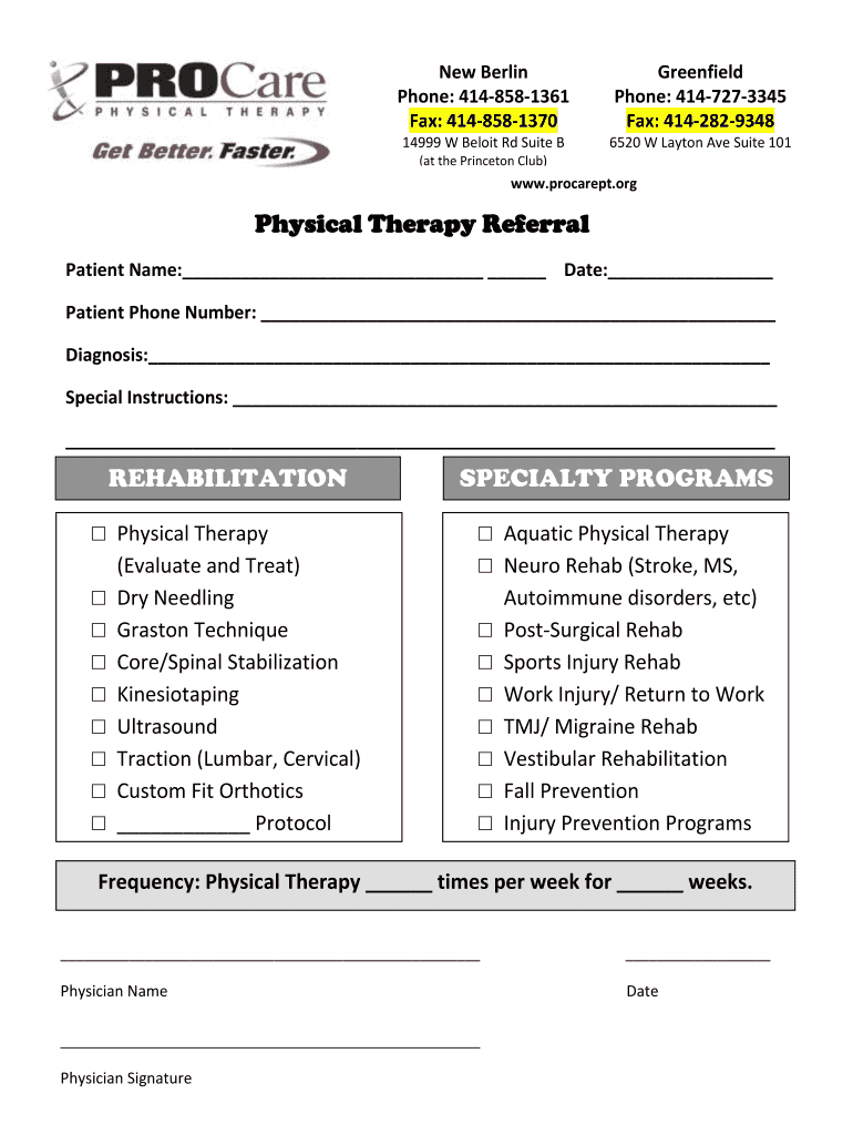 New Berlin Phone: 4148581361 Fax: 4148581370 Greenfield Phone: 4147273345 Fax: 4142829348 14999 W Beloit Rd Suite B 6520 W Layton Ave Suite 101 (at the Princeton Club) www.procarept.org Physical Therapy