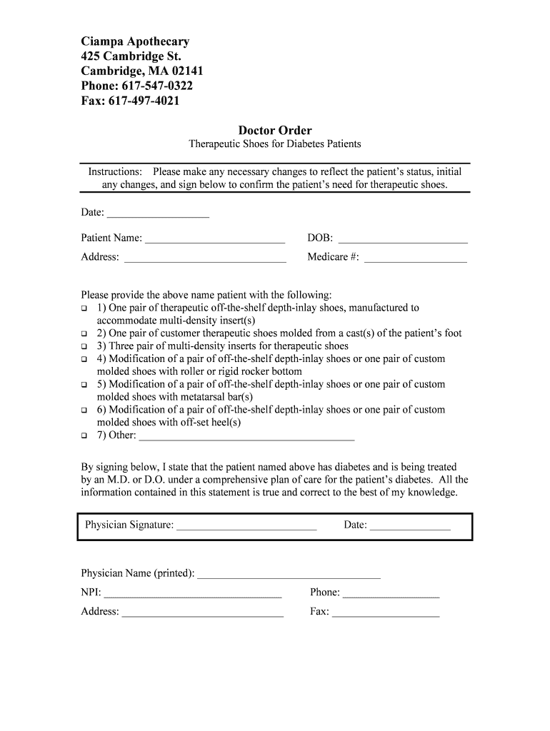Camp Apothecary 425 Cambridge St. Cambridge, MA 02141 Phone: 6175470322 Fax: 6174974021 Doctor Order Therapeutic Shoes for Diabetes Patients Instructions: Please make any necessary changes to reflect