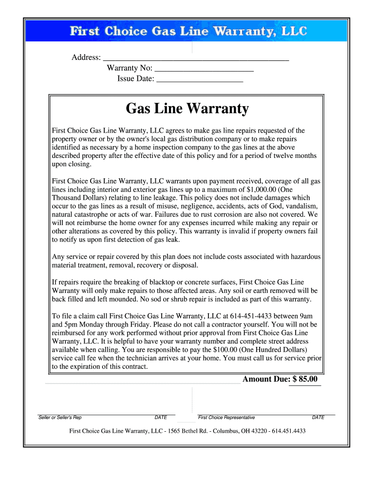 Address: Warranty No: Issue Date: Gas Line Warranty First Choice Gas Line Warranty, LLC agrees to make gas line repairs requested of the property owner or by the owner's local gas distribution company