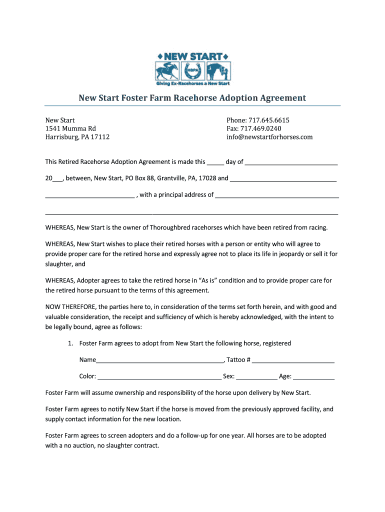 New Start Foster Farm Racehorse Adoption Agreement New Start 1541 Mummy Rd Harrisburg, PA 17112 Phone: 717.645.6615 Fax: 717.469.0240 info newstartforhorses.com This Retired Racehorse Adoption Agreement