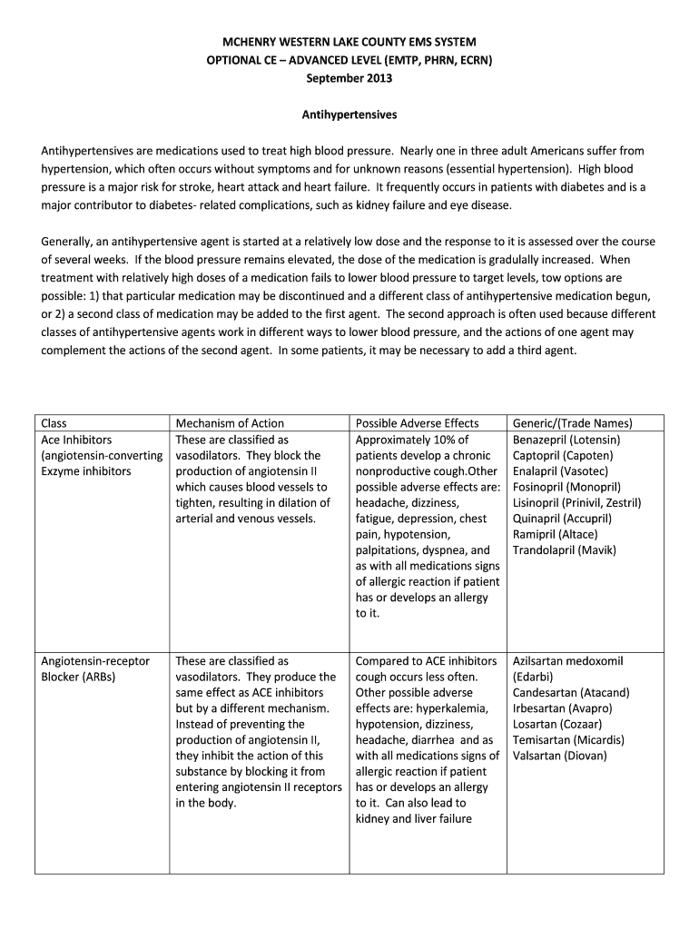 The Advanced Level Antihypertensive Medication Guide serves as a comprehensive educational resource tailored for healthcare professionals such as Emergency Medical Technicians Paramedics (EMTP), Prehospital Registered Nurses (PHRN), and Emergency Clinical Registered Nurses (ECRN). This guide is crucial for improving blood pressure management by enabling structured data collection on various antihypertensive medications.