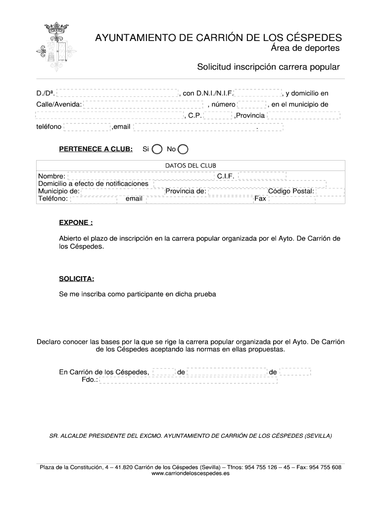 AYUNTAMIENTO DE CARRIE DE LOS SWEDES REA de deported Solicited inscription Carrera popular D./D. , con D.N.I./N.I.F., y domicile en, Nero, en El municipal DE Called/Agenda:, C.P. Teflon, Provincial,
