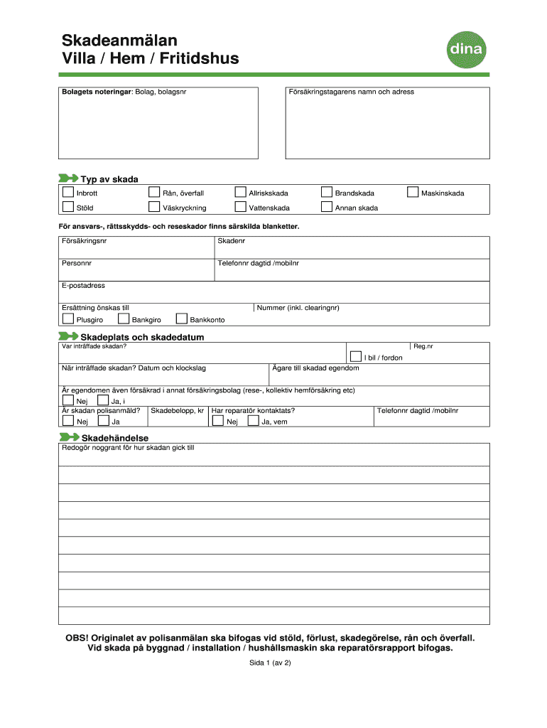Skadeanmlan Villa / Hem / Fritidshus Bola gets noteringar: Boleyn, Bologna Frskringstagarens name och address Top av SCADA Introit Rn, overall Allriskskada Randstad Maskinskada Sold Vskryckning Vattenskada