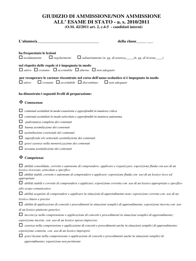 GIULIANO DI ADMISSION/NON ADMISSION ALL SAME DI STATE a. s. 2010/2011 (O.M. 42/2011 art. 2, c.45 candidate intern) L 'alumni/a Della class ha frequently LE legions assiduamente regolarmente saltuariamente