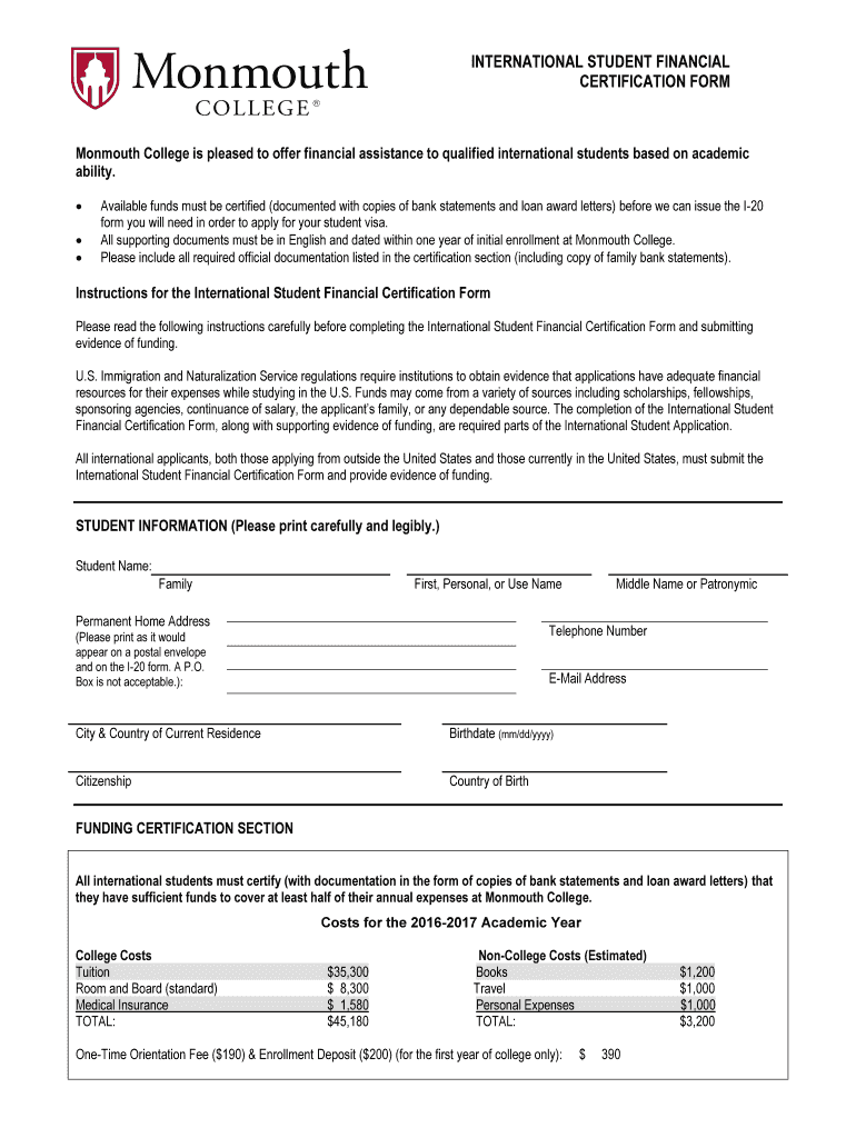 Get the free International student financial certification form - Monmouth College - ou monmouthc...