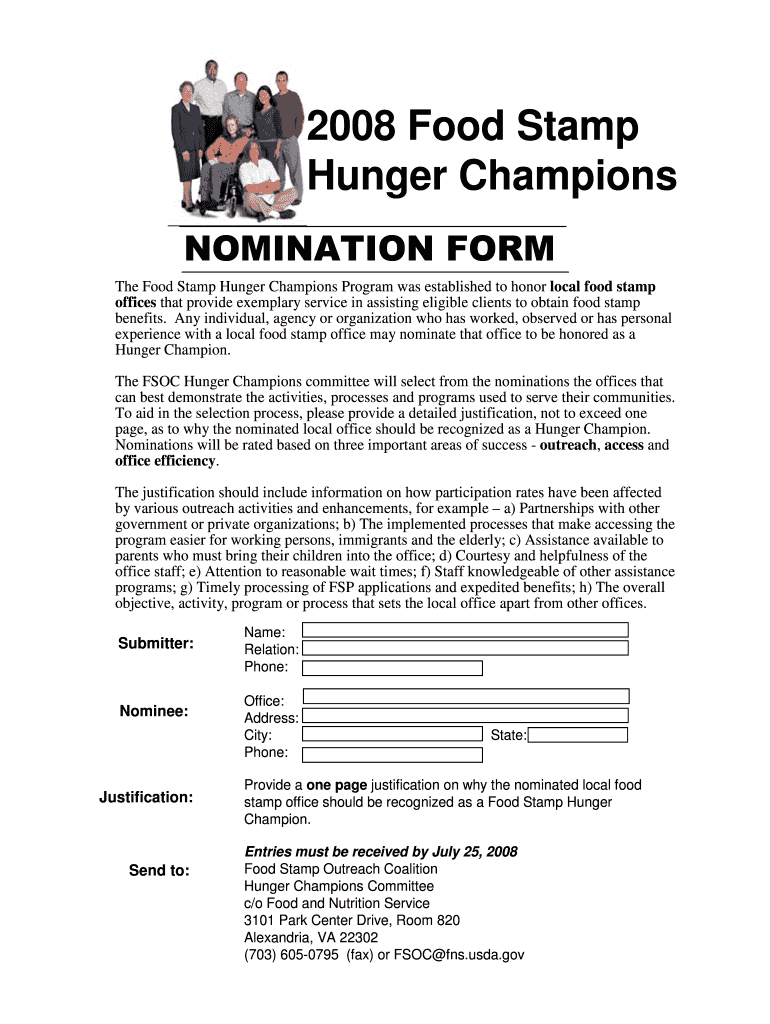 To fill out the 2008 Food Stamp Hunger Champions NOMINATION FORM, you need to provide the necessary details such as the nominee's information, a description of their contributions towards hunger alleviation, supporting evidence of their impact, and submit it to the designated authority within the specified deadline.