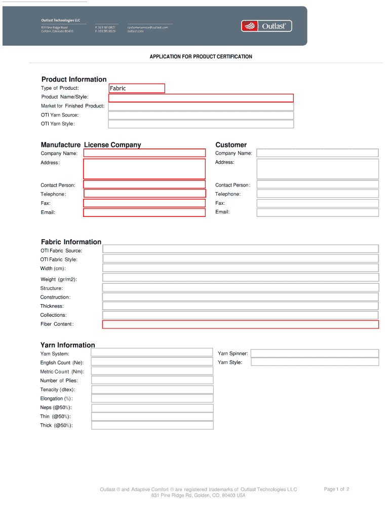 APPLICATION FOR PRODUCT CERTIFICATION Product Information Fabric Type of Product: Product Name/Style: Market for Finished Product: OTIS Yarn Source: OTIS Yarn Style: Manufacture License Company Customer