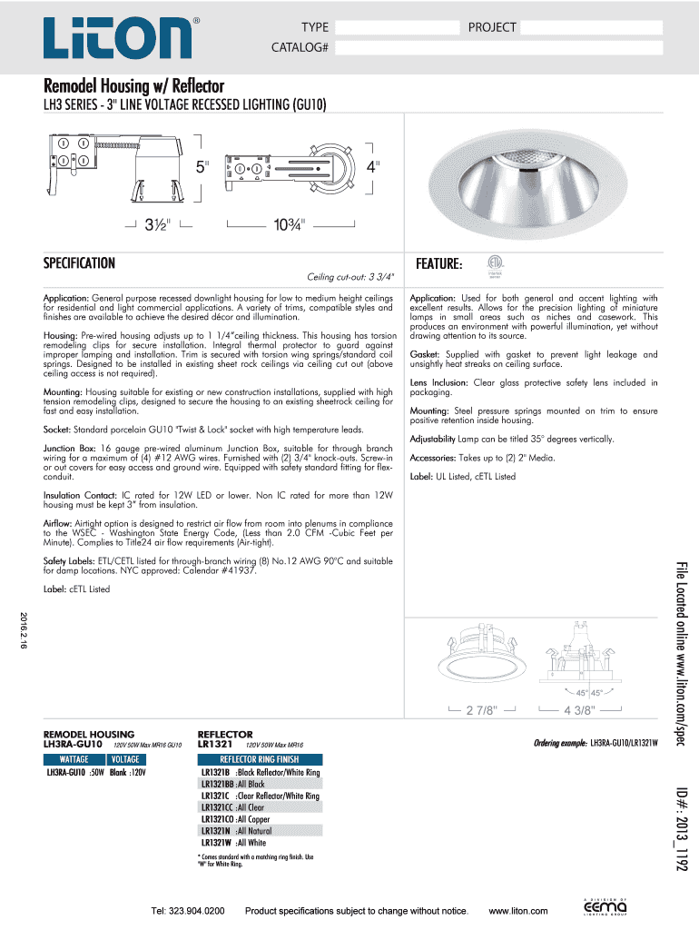 PROJECT INFORMATION PROJECT: TYPE: PROJECT CATALOG#: CATALOG# Remodel Housing w/ Reflector LH3 SERIES 3 LINE VOLTAGE RECESSED LIGHTING (GU10) 2 w SPECIFICATION FEATURE: Ceiling cutout: 3 3/4 Application: