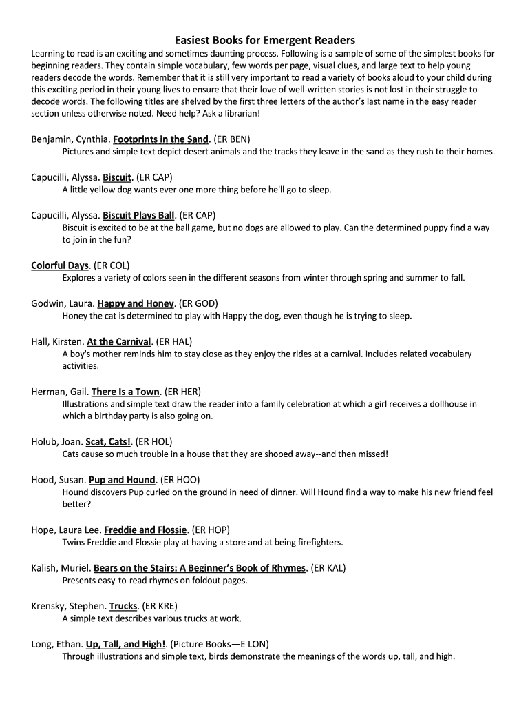 Get the free Easiest Books for Emergent Readers