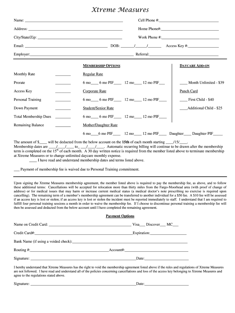Extreme Measures Name: Cell Phone #: Address: Home Phone#: City/State/Zip: Work Phone #: Email: DOB: / / Access Key #: Employer: Referral: MEMBERSHIP OPTIONS DAYCARE AD DON Monthly Rate Regular Rate