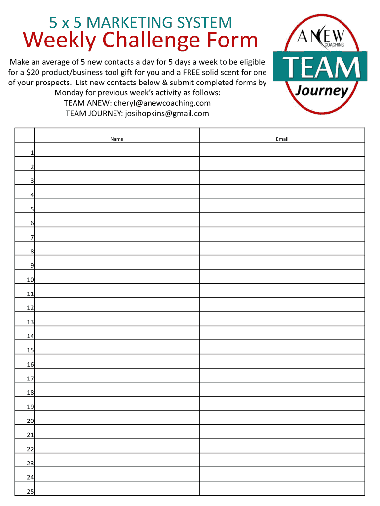 5 × 5 MARKETING SYSTEM Weekly Challenge Form Make an average of 5 new contacts a day for 5 days a week to be eligible for a ×20 product/business tool gift for you and a FREE solid scent for one