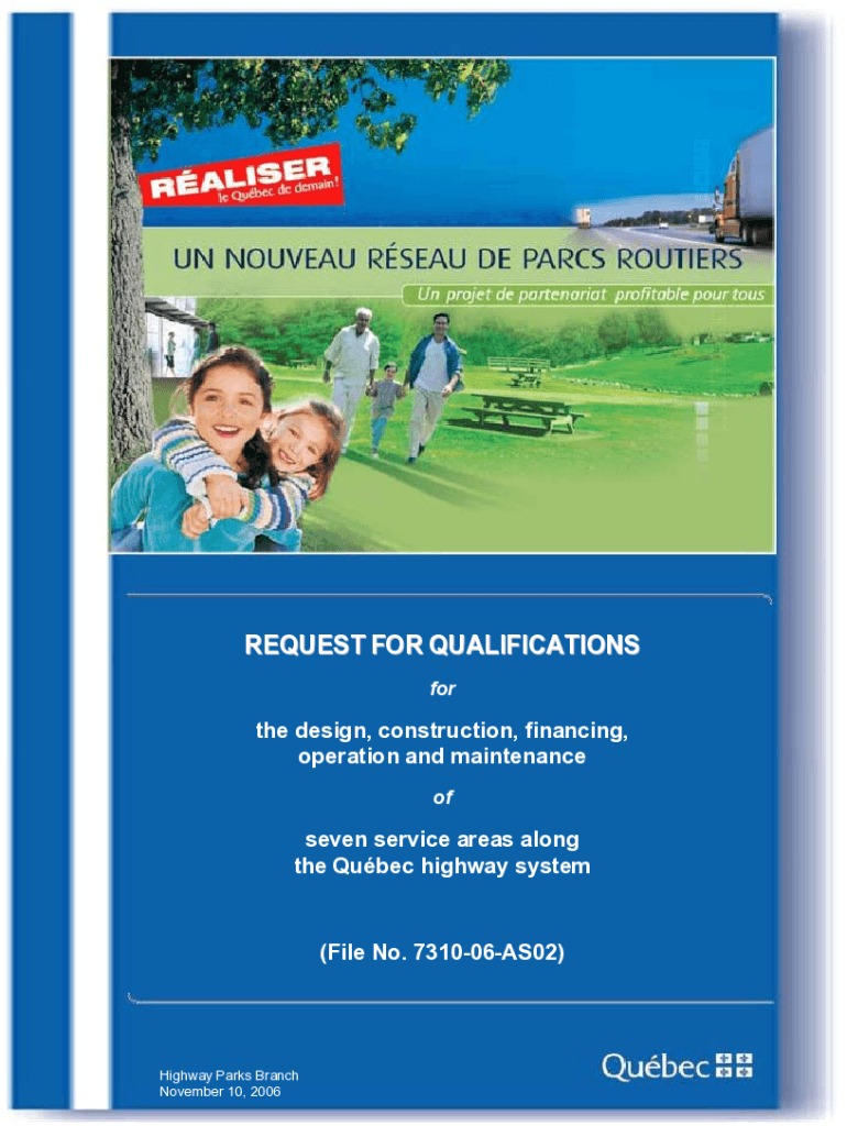 This document is a Request for Qualifications (RFQ) issued by the Ministère des Transports du Québec to identify and select potential partners for the design, construction, financing, operation,