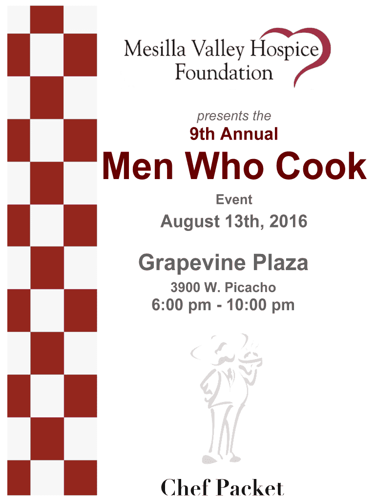 Presents the 9th Annual Men Who Cook Event August 13th, 2016 Grapevine Plaza 3900 W. Picasso 6:00 pm 10:00 pm Chef Packet Are you a man who is willing to cook for a good cause? If so, we need you!