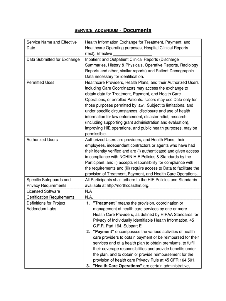 SERVICE ADDENDUM Service Name and Effective Date Data Submitted for Exchange Permitted Uses Authorized Users Specific Safeguards and Privacy Requirements Licensed Software Certification Requirements