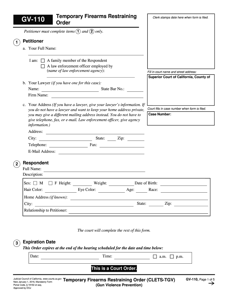 Temporary Firearms Restraining Order GV110 Clerk stamps date here when form is filed. Petitioner must complete items 1 and 2 only. 1 Petitioner a. Your Full Name: I am: A family member of the Respondent