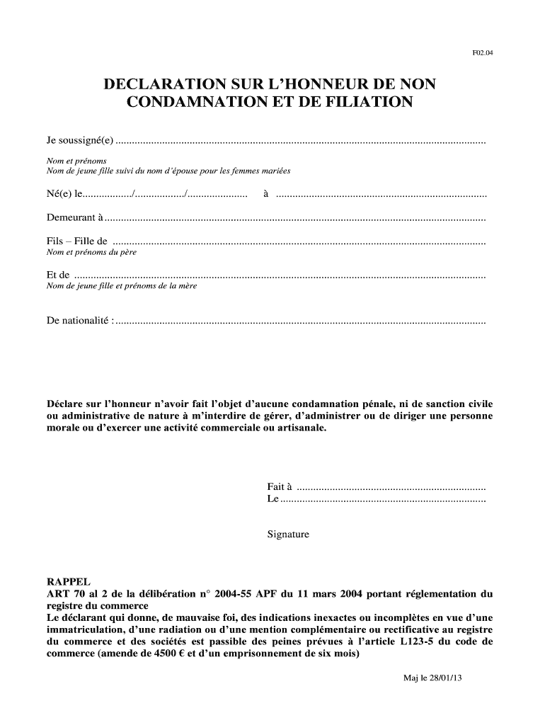 Obtenir le gratuit Declaration sur l'honneur de non condamnation et de filiation - CCISM - ccism