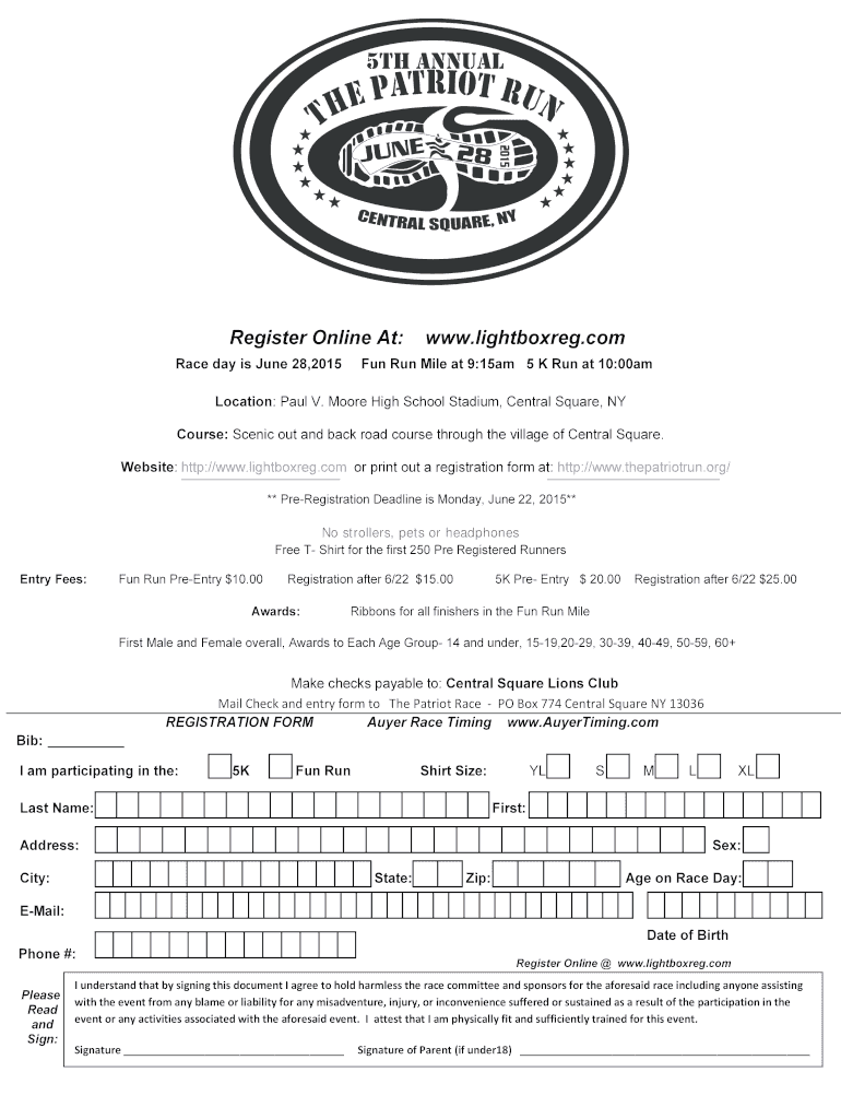 Register Online At: Race day is June 28, 2015 www.lightboxreg.com Fun Run Mile at 9:15am 5 K Run at 10:00am Location: Paul V. Moore High School Stadium, Central Square, NY Course: Scenic out and back
