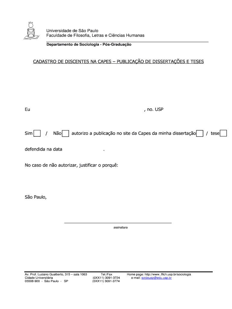 Universidade de So Paulo Facade de Filosofia, Tetras e Cinemas Humans Department de Sociologia Gradual CASTRO DE DISSENTED NA CAPES PUBLICAN DE DESSERTS E TESTS Eu Sim, no. USP / No authorize a publican