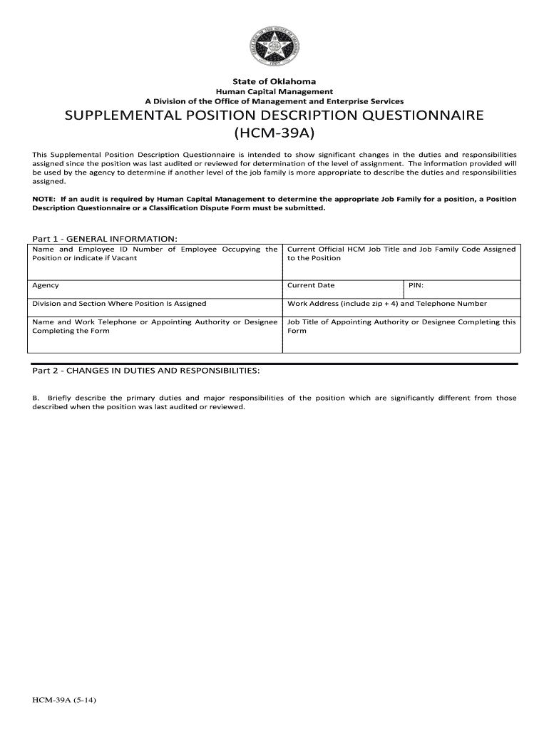 State of Oklahoma Human Capital Management A Division of the Office of Management and Enterprise Services SUPPLEMENTAL POSITION DESCRIPTION QUESTIONNAIRE (HCM39A) This Supplemental Position Description