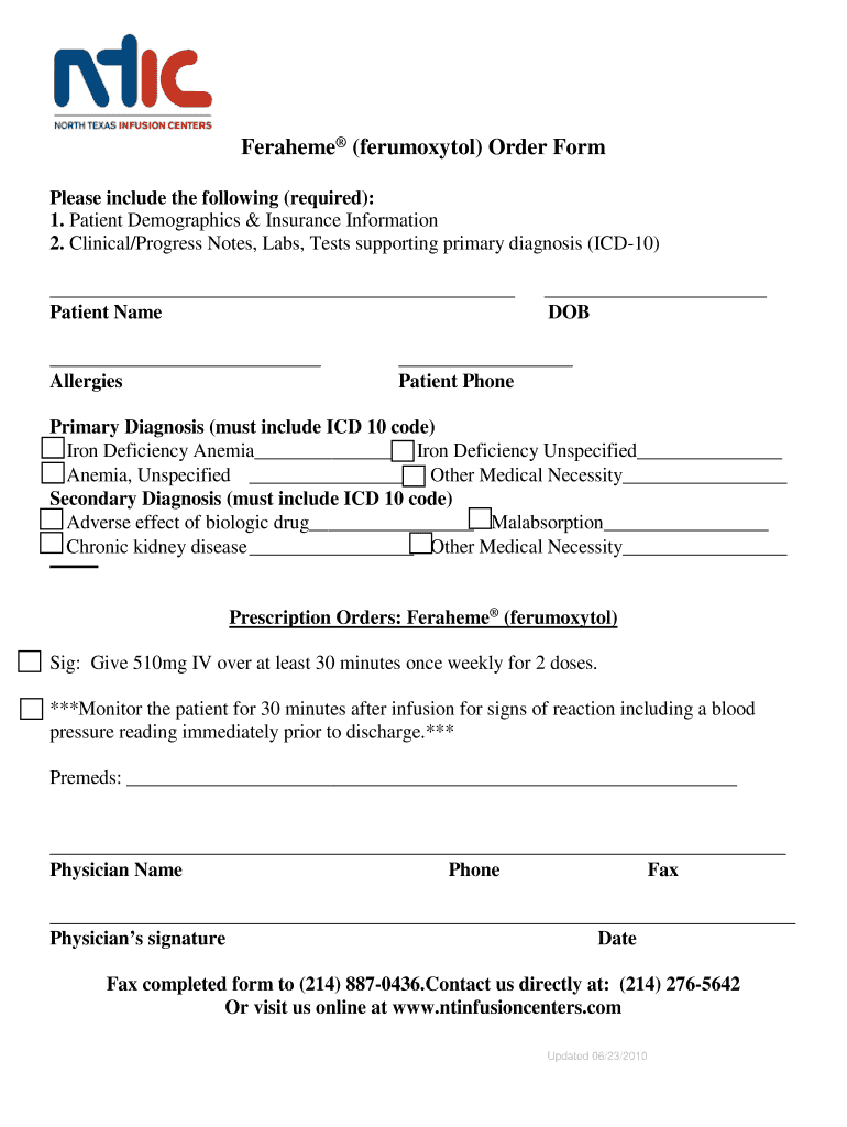 How to fill out a Feraheme Ferumoxytol Order Form: