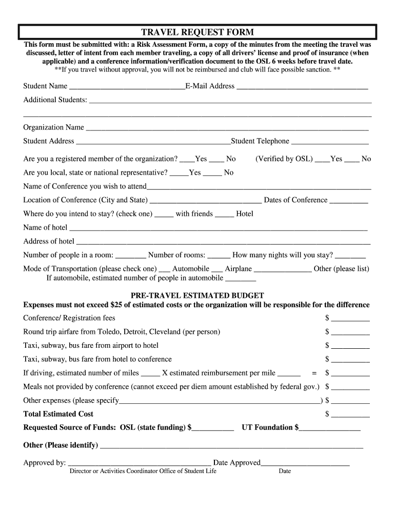 Get the free BTRAVELb REQUEST bFORMb - utoledo