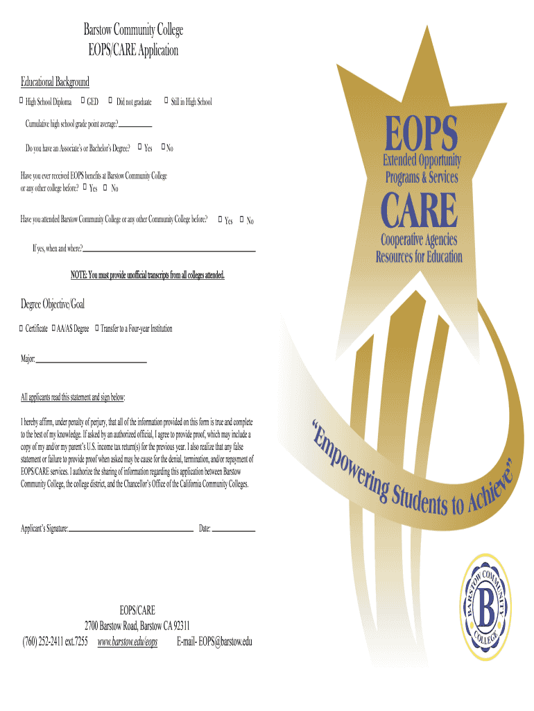 Students who qualify as disadvantaged and in need of extra support are required to file Barstow Community College EOPSCARE.