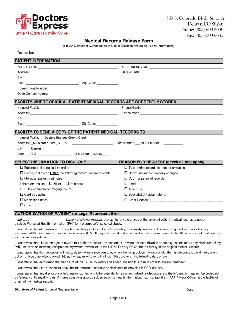 Get the free Medical Records Release bFormb - Urgent Care Denver CO Cherry bb