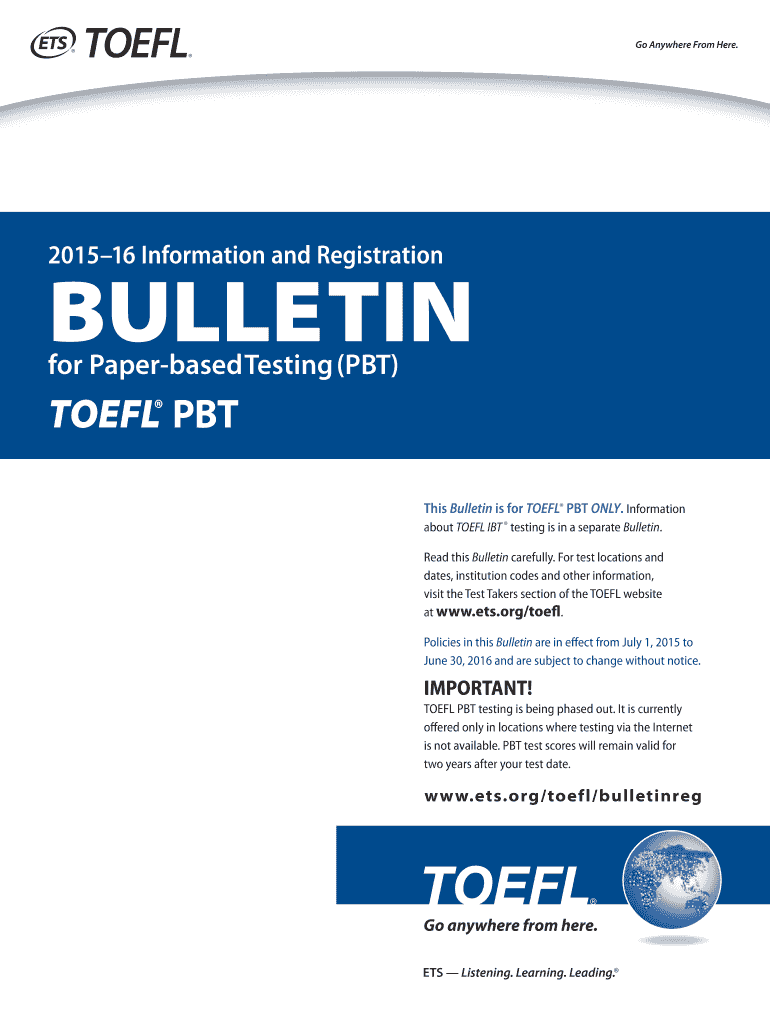 201516 Information and Registration BULLETIN for Paper based Testing (PBT) TOEFL PBT This Bulletin is for TOEFL PBT ONLY. Information about TOEFL IT testing is in a separate Bulletin. Read this Bulletin